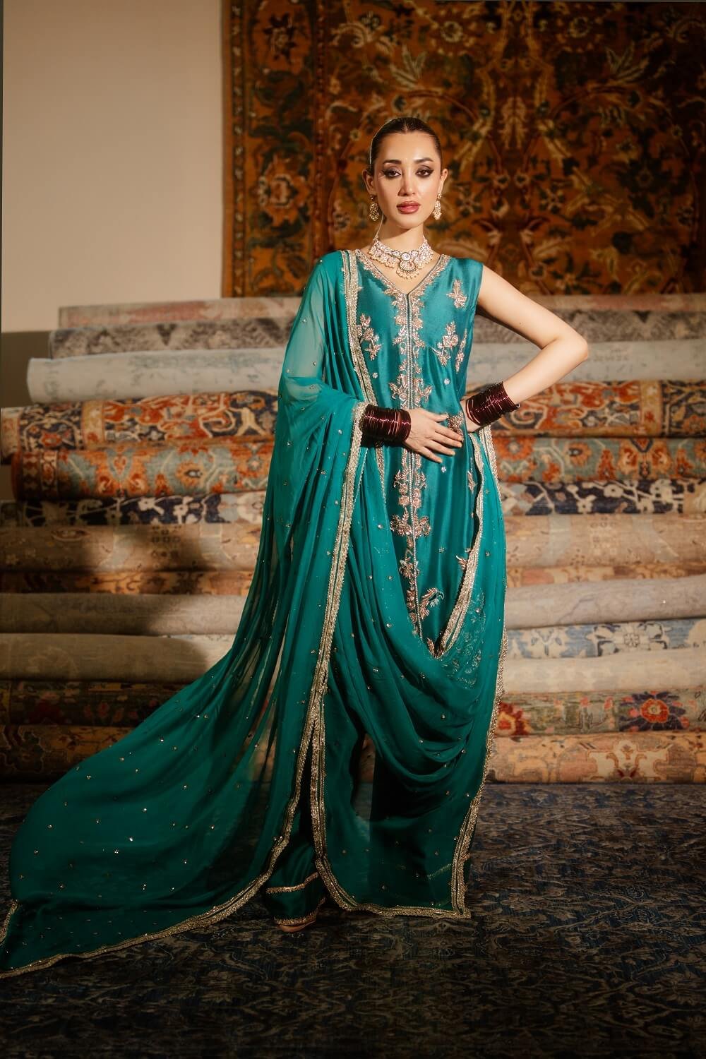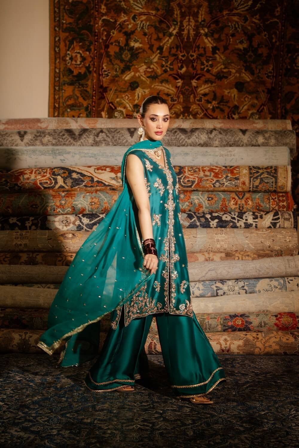A teal ensemble fully embellished with handcrafted kora, dubka, sitara, and Swarovski detailing, giving it a glimmering, textured finish. The meticulous handwork adds a regal and festive charm, making it a standout choice for celebrations!