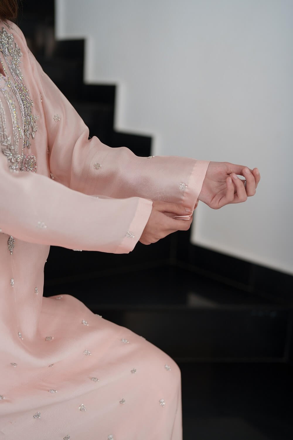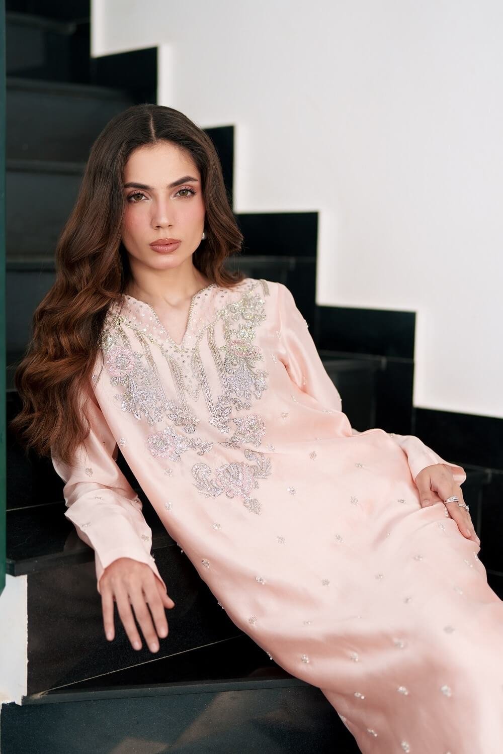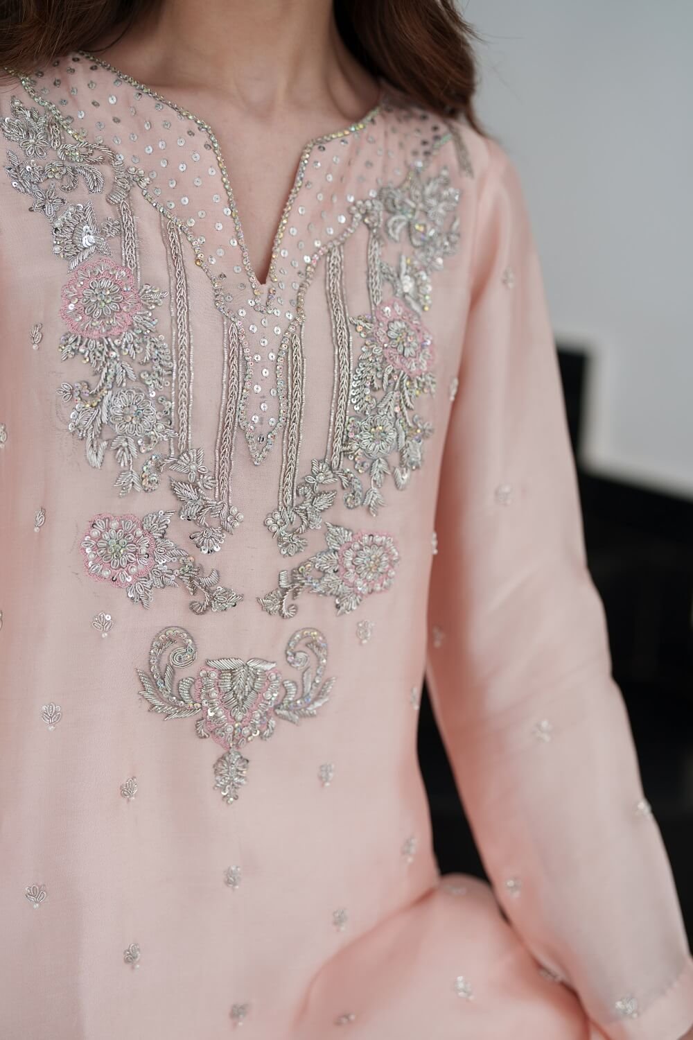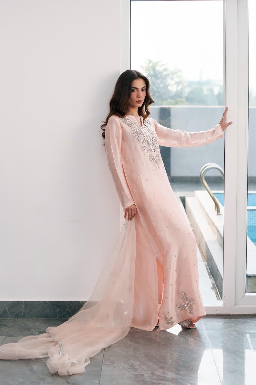 This elegant pink kaftan-style shirt is a beautiful fusion of comfort and sophistication. Adorned with intricate handwork, it showcases fine craftsmanship while maintaining a relaxed, flowing silhouette. Paired with tailored straight pants for a balanced look and complemented by a delicately handworked dupatta, this ensemble radiates effortless charm perfect for festive gatherings and graceful evening wear.