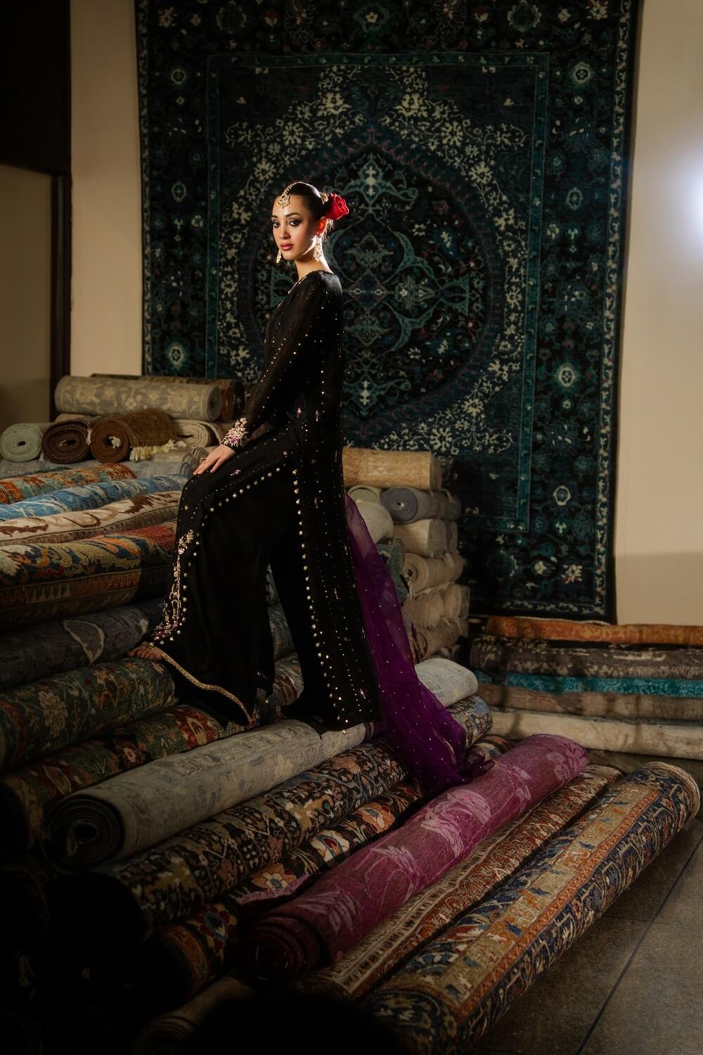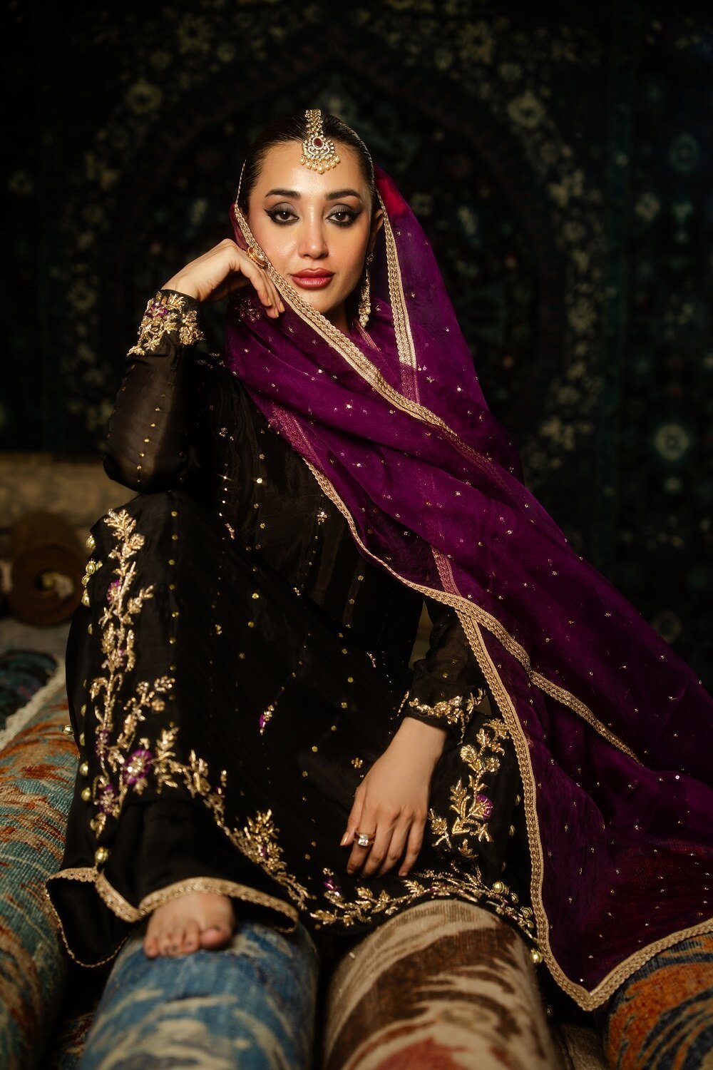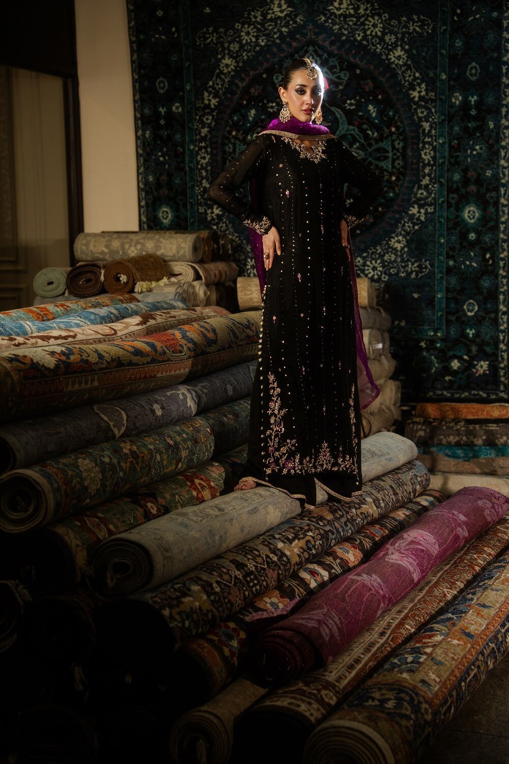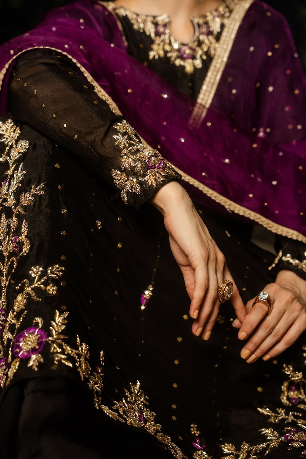 A stunning black outfit featuring a shirt with intricate hand work in delicate floral motifs. The detailing shimmers beautifully along the neckline, sleeves, and hem. Paired with laced black trousers, the look is completed with a contrasting dupatta in a pure, vibrant colour. In short the outfit is timeless which is perfect to be worn on any festive event!