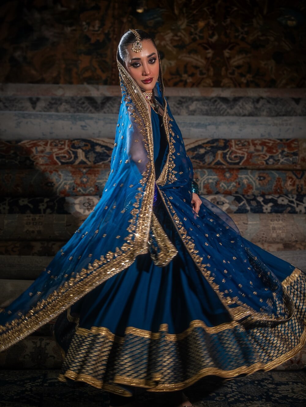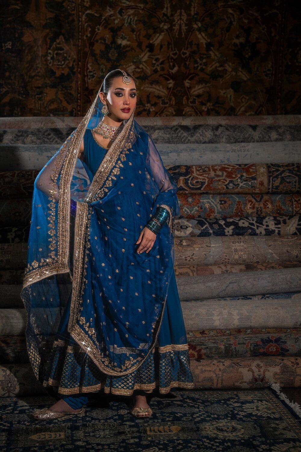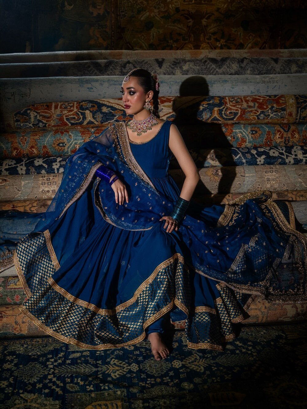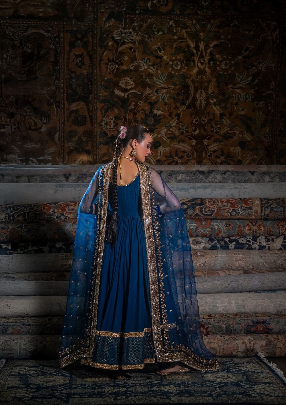 A sophisticated pishwas accented with Banarasi fabric and lace details for a refined traditional touch. Paired with an exquisitely handworked dupatta, this ensemble embodies understated elegance and timeless craftsmanship!