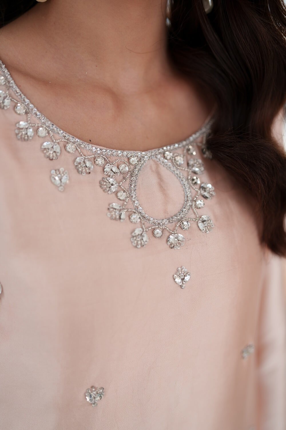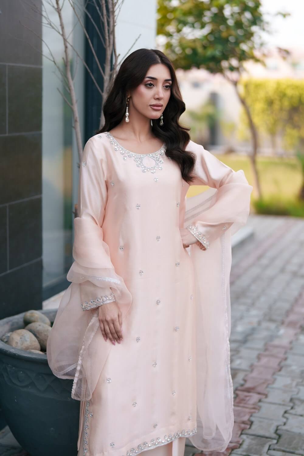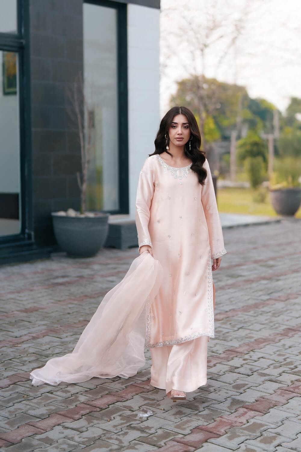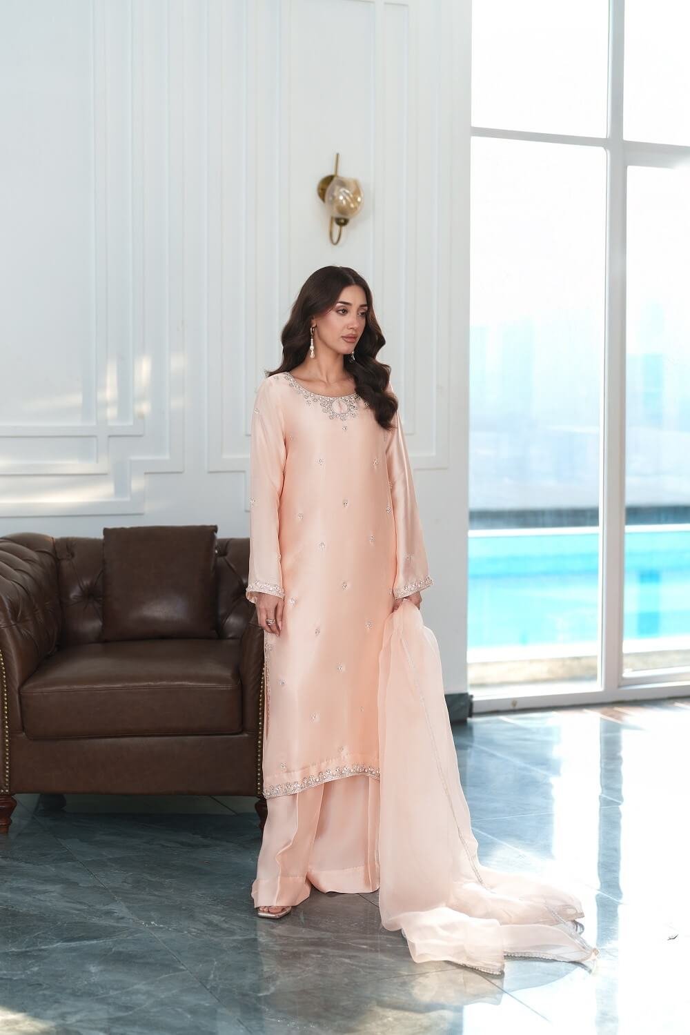 This enchanting peach ensemble exudes soft elegance and refined craftsmanship. The shirt is delicately adorned with intricate handwork, adding texture and a subtle glow to its warm, graceful tone. Styled with flowing flared pants that create a flattering silhouette and paired with pure organza dupatta for an ethereal finish, this outfit beautifully blends sophistication with contemporary charm perfect for festive occasions and intimate celebrations!